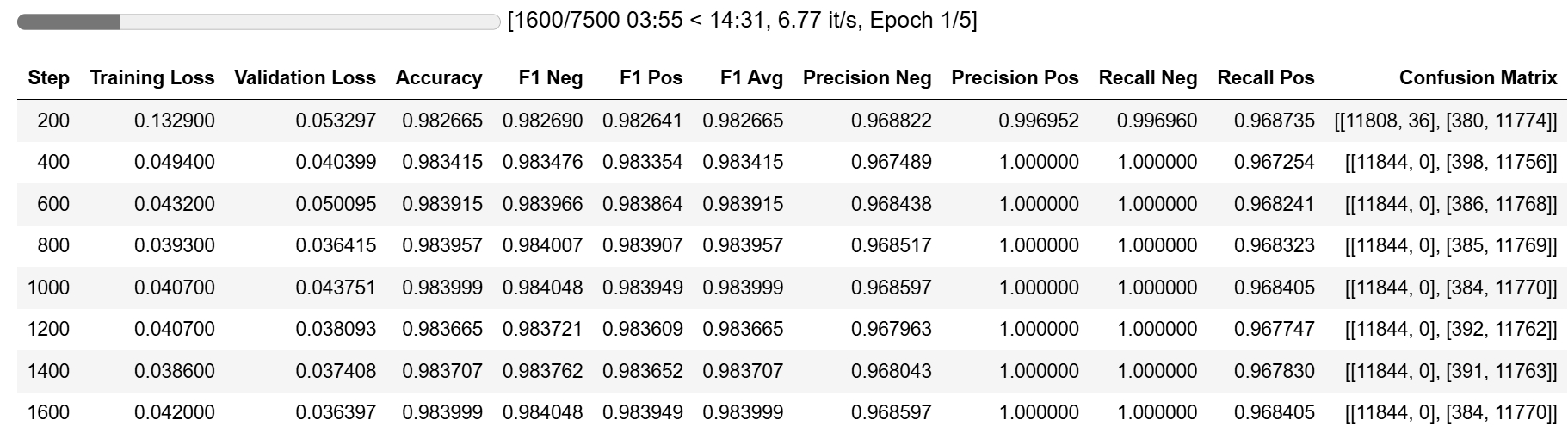 The model achieved excellent metrics after just one epoch.