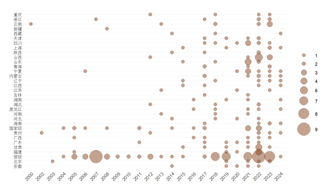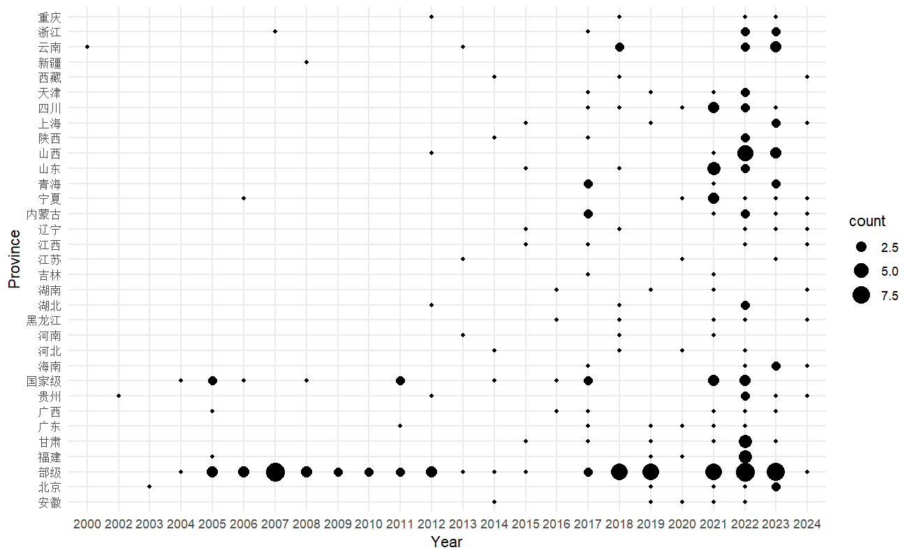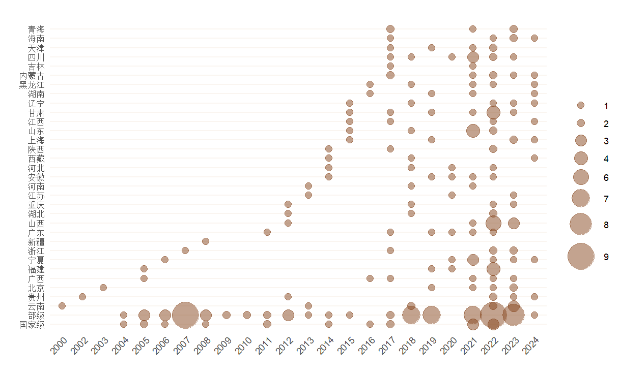 In a data journalism project, we aimed to analyze the distribution of policies related to Intangible Cultural Heritage (ICH) across various provinces in China. Our focus was on several aspects: identifying years when individual provinces concentrated on policy implementation, comparing policy enactment across provinces during the same period, and highlighting specific time points when multiple provinces simultaneously introduced numerous policies. For this purpose, we chose the Proportional Symbol Chart as our primary visualization strategy.